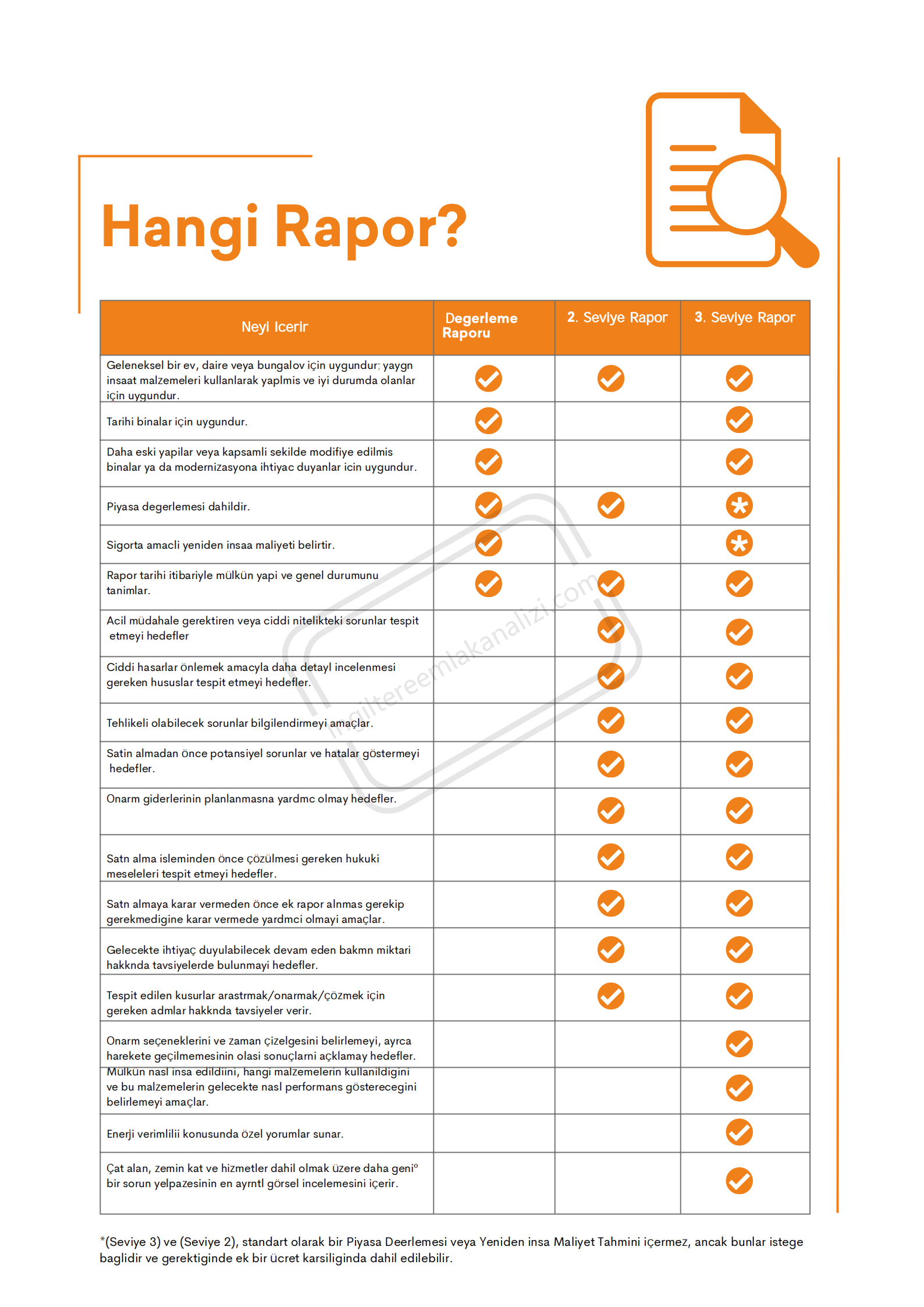 2. Seviye Rapor: Genellikle makul durumda olan geleneksel mülkler için uygun olan rapor çeşididir, çökme veya nem gibi yapısal sorunlar ile içeride ve dışarıda başka gizli sorunları tespit etmenize yardımcı olur. Bu rapor, zemin tahtalarının altına veya duvarların arkasına bakmaz.
